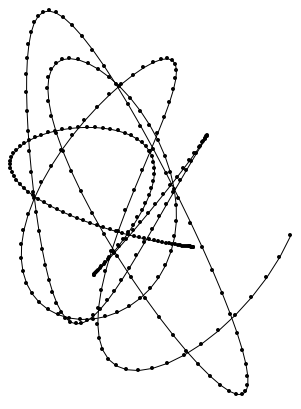 Linkage is a SVG animation based on a segmented line where the angles between segments vary — to the point of wrapping around and making curls — linearly along the line. Links are provided to change parameters of the animation.